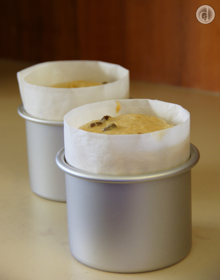 To make this bread I used two 10 cm round cake tins (height 7 cm). I used this sized tin to ensure the bread would not collapse on cooling. I used a tin instead of Panettone cases as I was not sure that the case would be strong enough to support the bread during baking. You will need some strong bamboo skewers for cooling the Panettone.