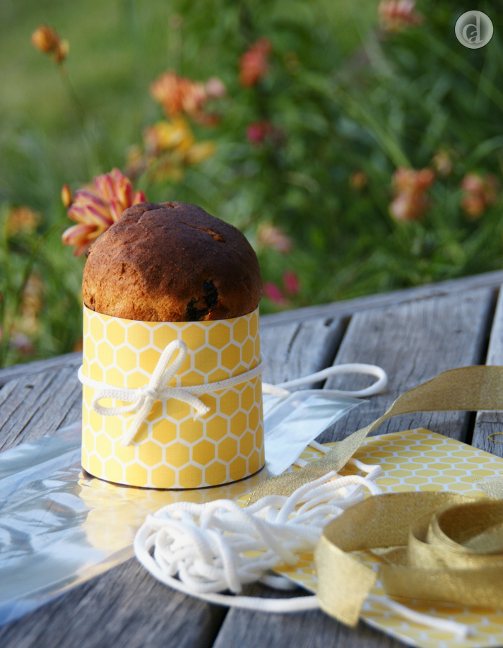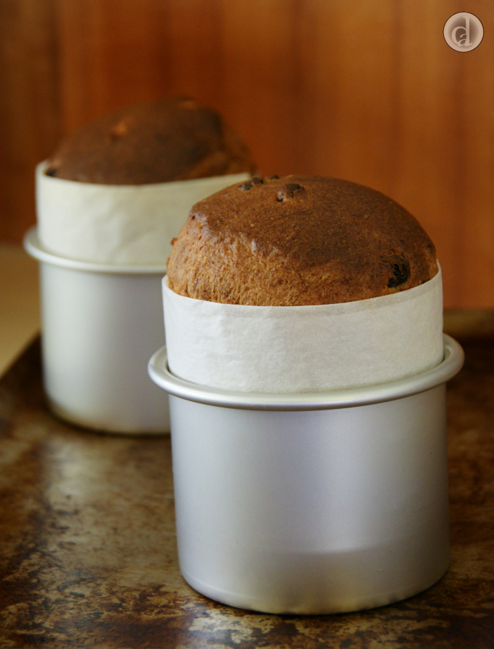 Panettone are usually hung upside to cool (to ensure that the beautiful domed top doesn't collapse). You can either cool the Panettone by leaving them on their sides and rotating every 10 mins or so or by inserting 2 bamboo skewers, at right angles to each other, halfway through the loaf. Hang the Panettone upside down by resting the bamboo skewers on the edges of a saucepan or bowl. I have put the skewers at right angles to give more support to the bread during cooling. This is instead of parallel close to the sides of the bread that you will often see in cooling wheat based Panettone.