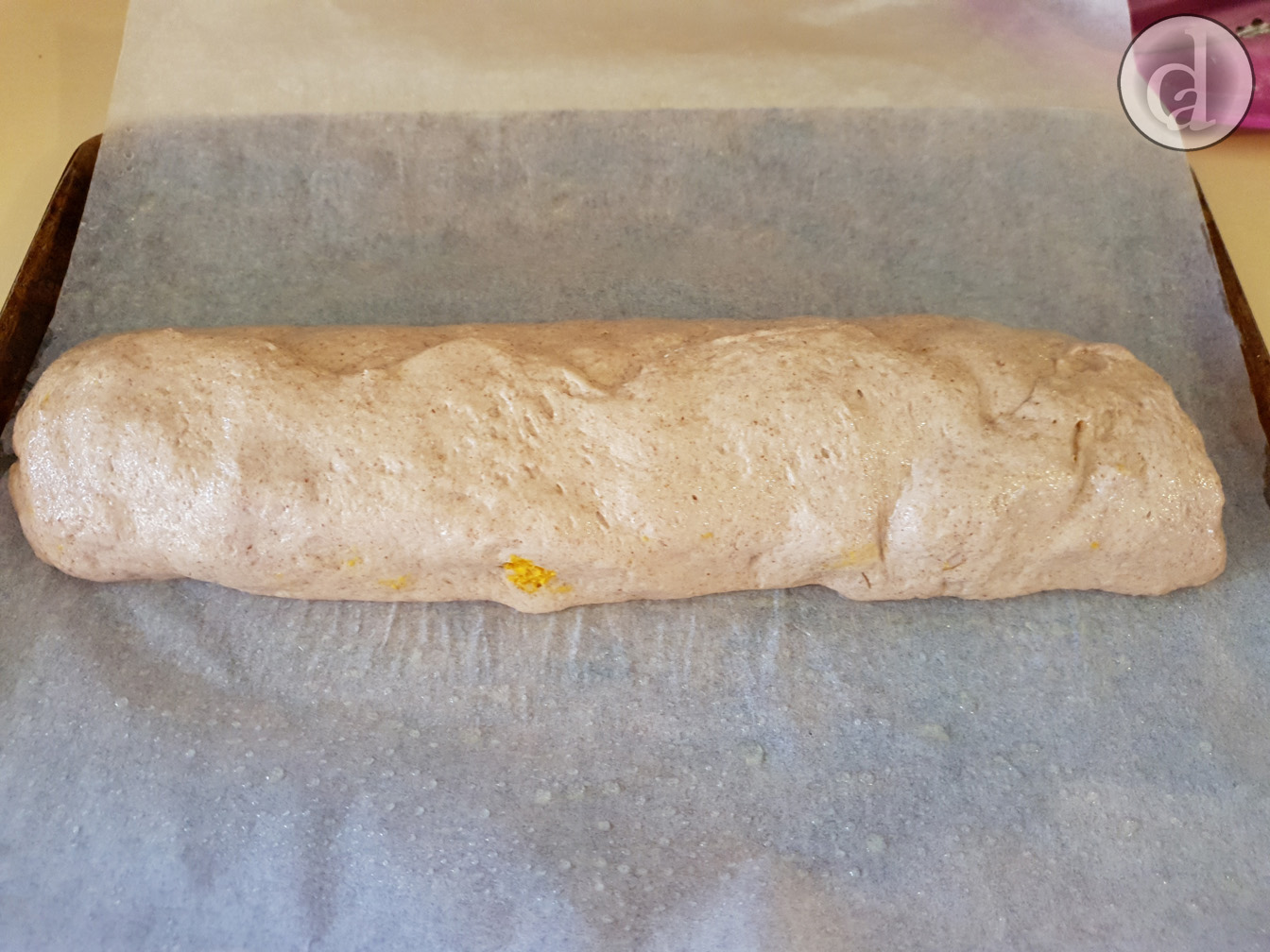 Gently roll up the dough into a log. As the dough will be soft use the baking paper to start forming the roll.
