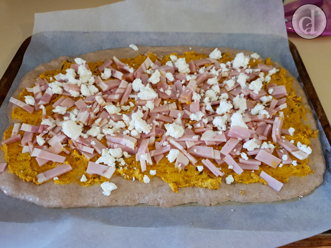 Top the dough with pizza toppings. Leave a 5 cm gap around the edges. (I blitzed the roast pumpkin with the oil & 2 cubes of cheese)